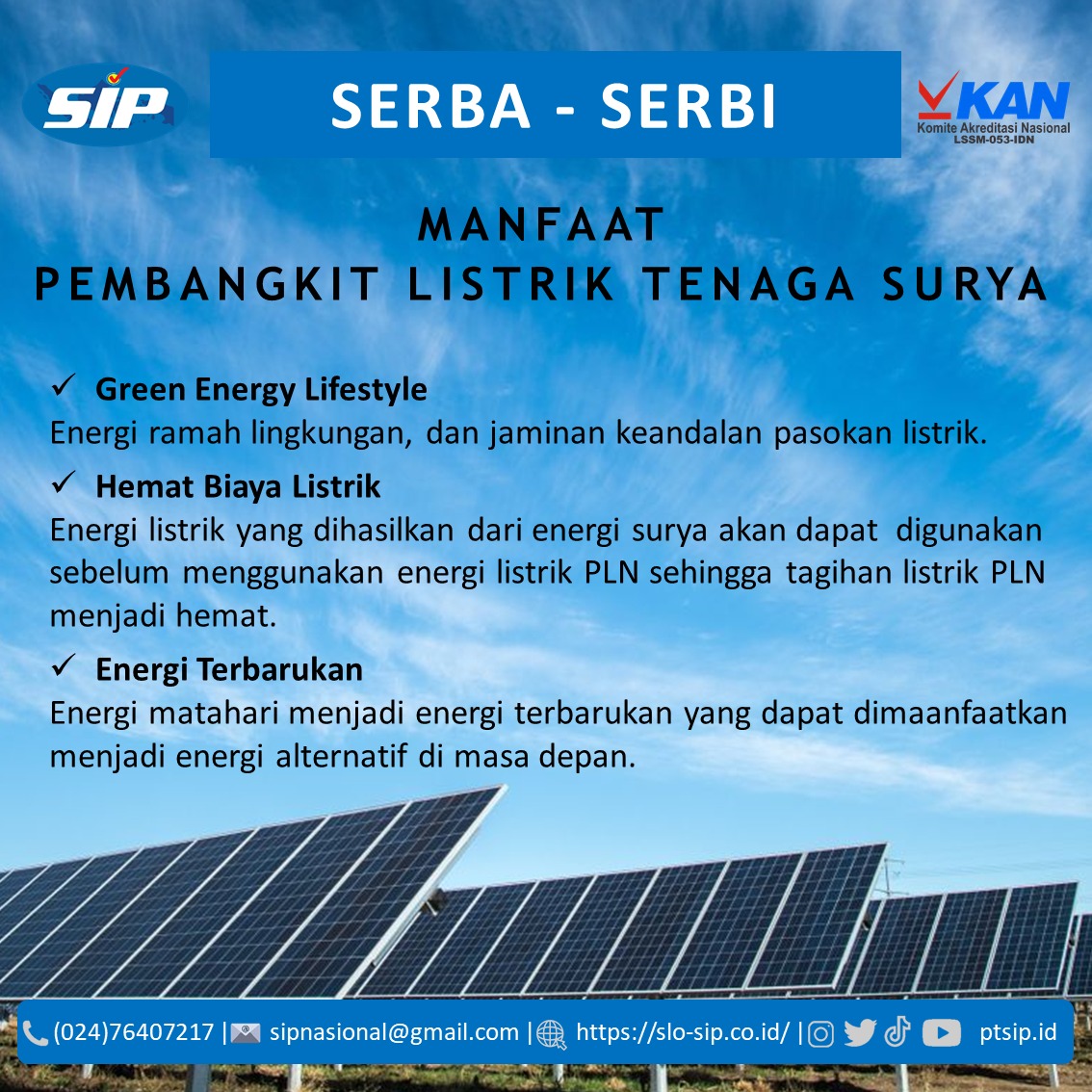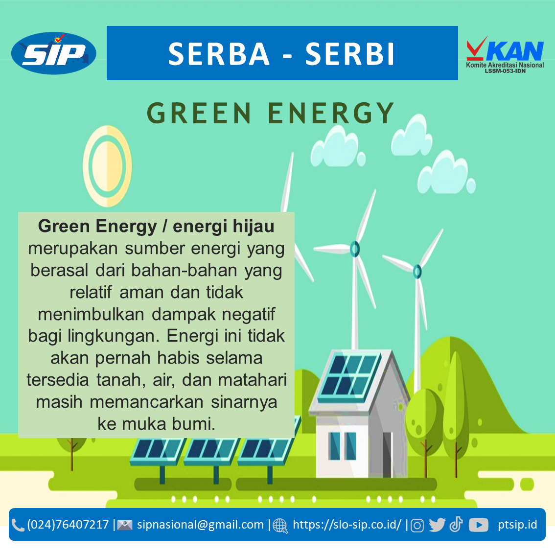 Energi bersih untuk masa depan. Green Energy adalah energi ramah lingkungan yang berasal dari sumber alam seperti matahari, air, dan angin, serta dapat diperbarui secara berkelanjutan.#SLOSIP #SertifikasiInstalasiPrima #SerbaSerbiKetenagalistrikan #PTSIP