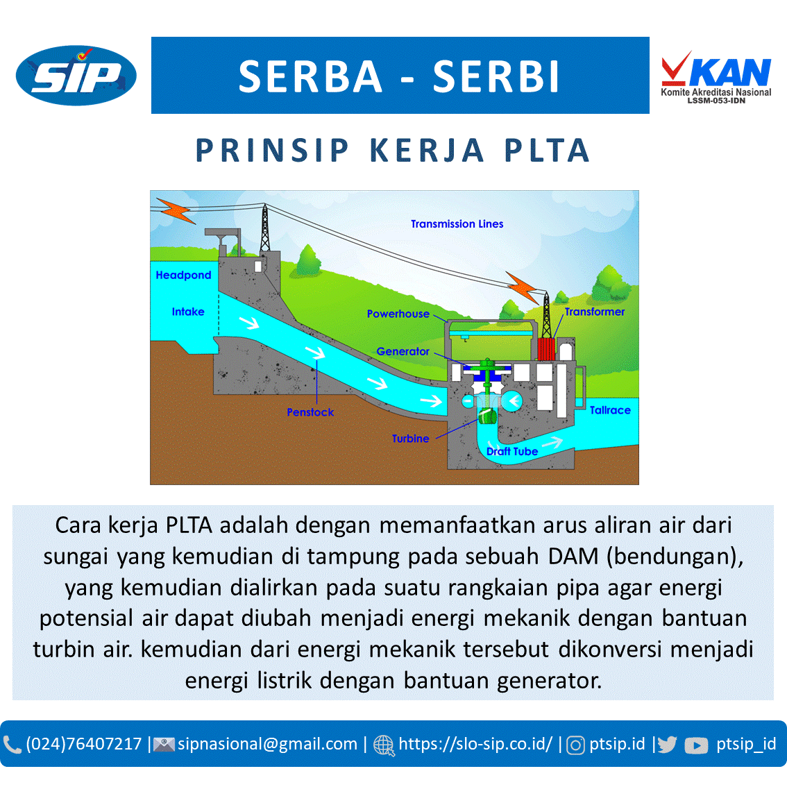 Pembangkit Listrik Tenaga Air PLTA memanfaatkan energi dari aliran air untuk memutar turbin yang kemudian menghasilkan listrik. #SLOSIP #SertifikasiInstalasiPrima #SerbaSerbiKetenagalistrikan #PTSIP