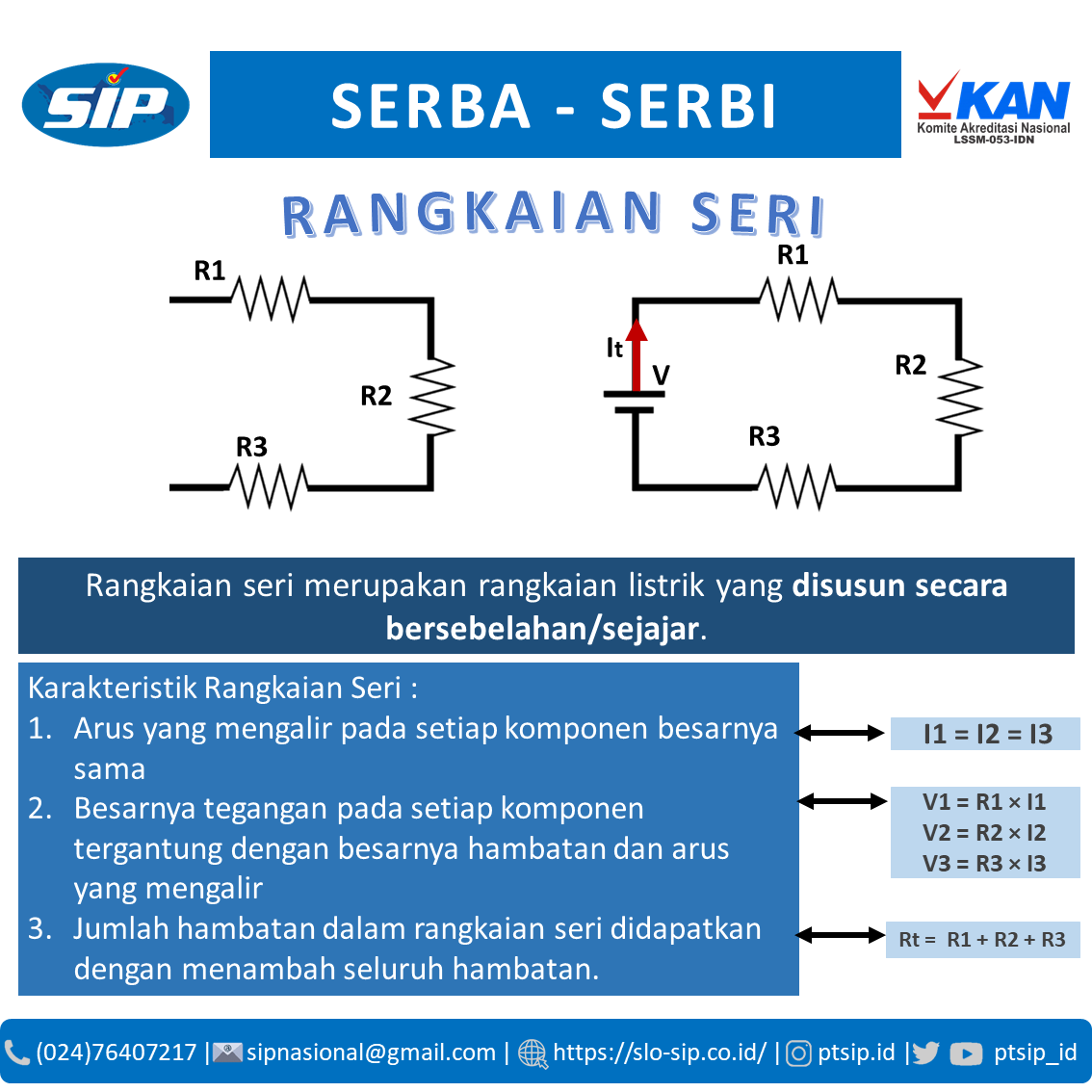 Rangkaian seri adalah rangkaian listrik di mana komponen disusun berurutan dalam satu jalur arus. Pada rangkaian ini, arus yang mengalir pada setiap komponen sama, sedangkan total hambatan merupakan penjumlahan dari seluruh hambatan yang ada dalam rangkaian. #SLOSIP #SertifikasiInstalasiPrima #SerbaSerbiKetenagalistrikan #PTSIP